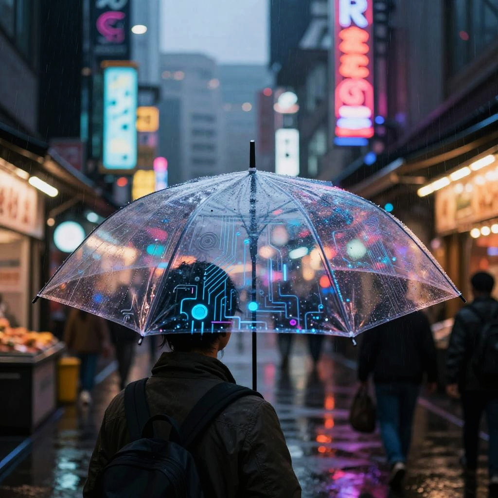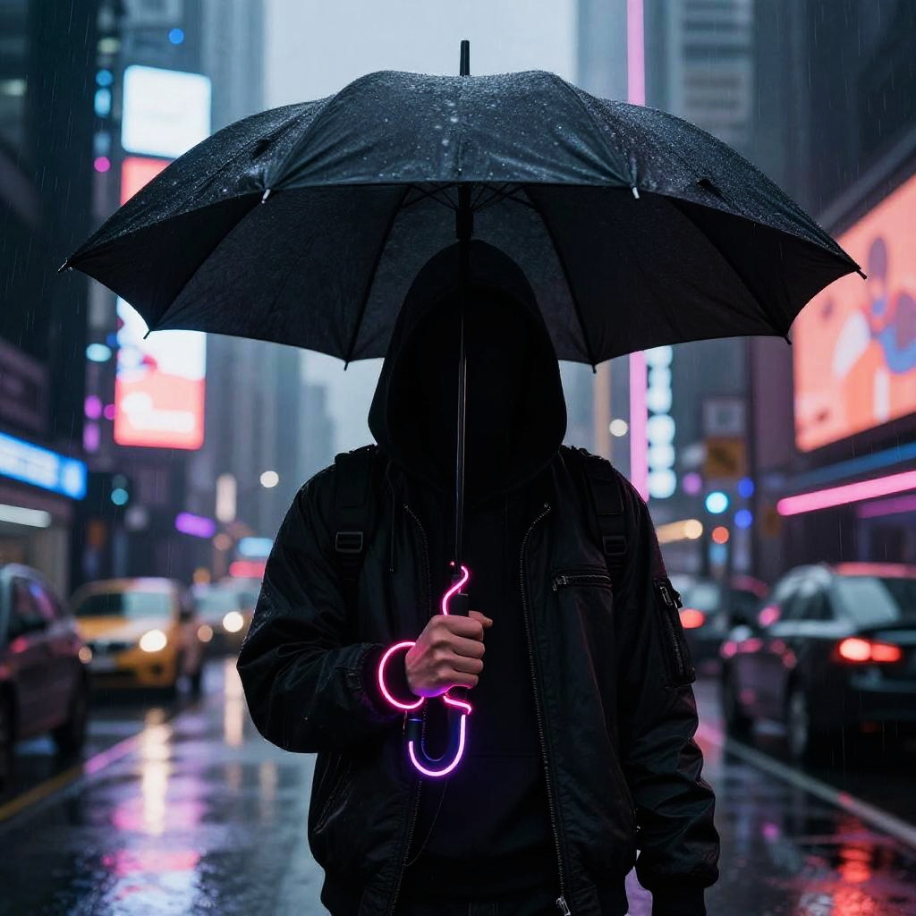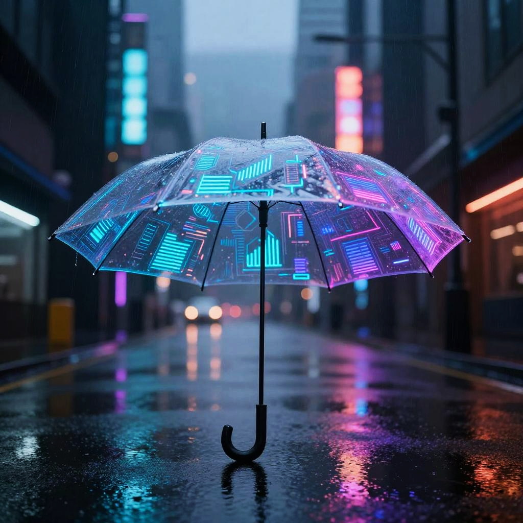 Cyberpunk umbrella with translucent panels displaying digital rain, neon-lit cityscape in the background, sleek futuristic design, atmospheric and moody cyberpunk aesthetic