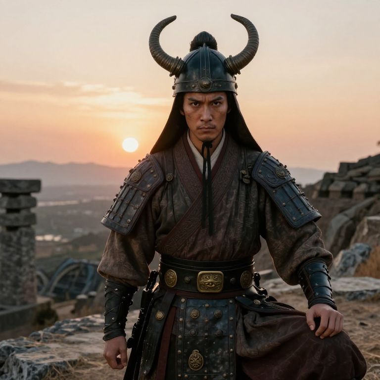 A lifelike portrait of a warrior from the Warring States period in ancient Chinese military attire, including a wide-sleeved tunic, a belt with bronze buckles, and a helmet with horned design, posing on a mountain plateau during sunset, her face rugged and determined with sharp jawline and dark, deep-set eyes, surrounded by rugged terrain and ancient stone ruins.