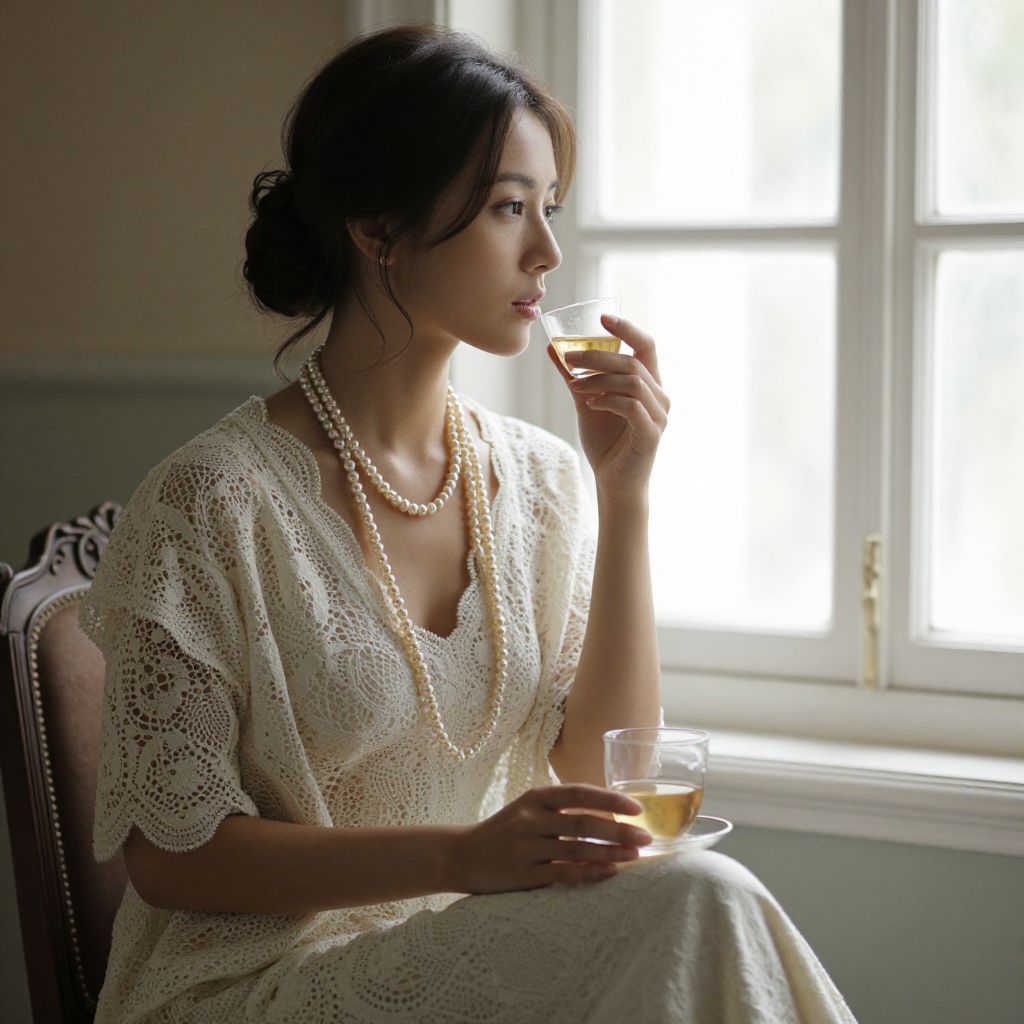 In a moment suspended between tradition and introspection, a woman adorned in pearls and lace sits by a sunlit window, her gaze drifting outward as if seeking solace in the quiet stillness of tea and thought, evoking a profound sense of contemplation and the delicate balance of inner peace amidst the passage of time.