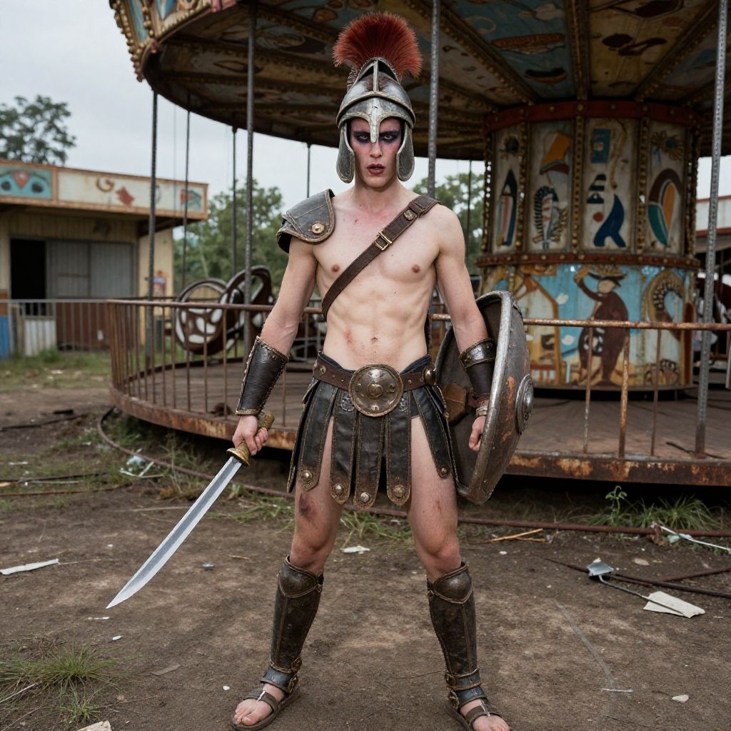 Grunge style, photo of man, ((Establishing shot:1.7)(gladiator, dreesed, Unlimited Blade Works, very skinny slender fit-muscled body, wearing armor bracers and leg splints with legionary helmet and sandals, Shield, DualWielding, injury)), dynamic background Derelict Amusement Park, rusting, decaying, empty rides, extremely detailed face eyes lips, (face:Inverted Triangle Face, Upturned Eyes, [eye color grey], Nose with an Angular Shape, full lips, flat cheeks, square chin), heavy slut makeup, heavy slut blusher, heavy slut eye shadow, heavy slut eyeliner, heavy slut mascara, heavy slutlip liner, red lipstick, ((ultra realistic, extremely fine details, natural skin texture)), extremely detailed eyes lips nose, Textured, distressed, vintage, edgy, punk rock vibe, dirty, noisy