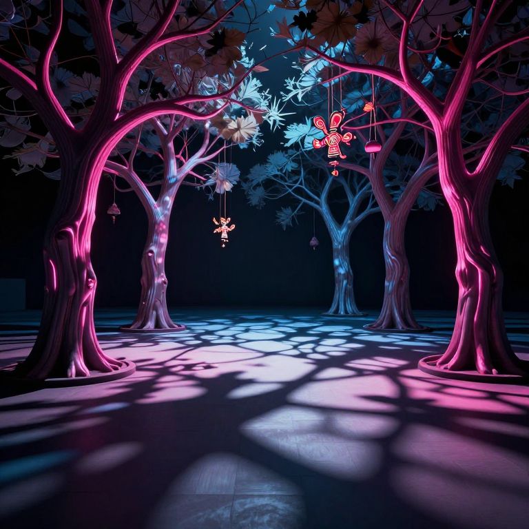 Digital art of a glowing, neon-lit forest with pink and blue illuminated trees, shadow patterns on the ground, and hanging butterflies.