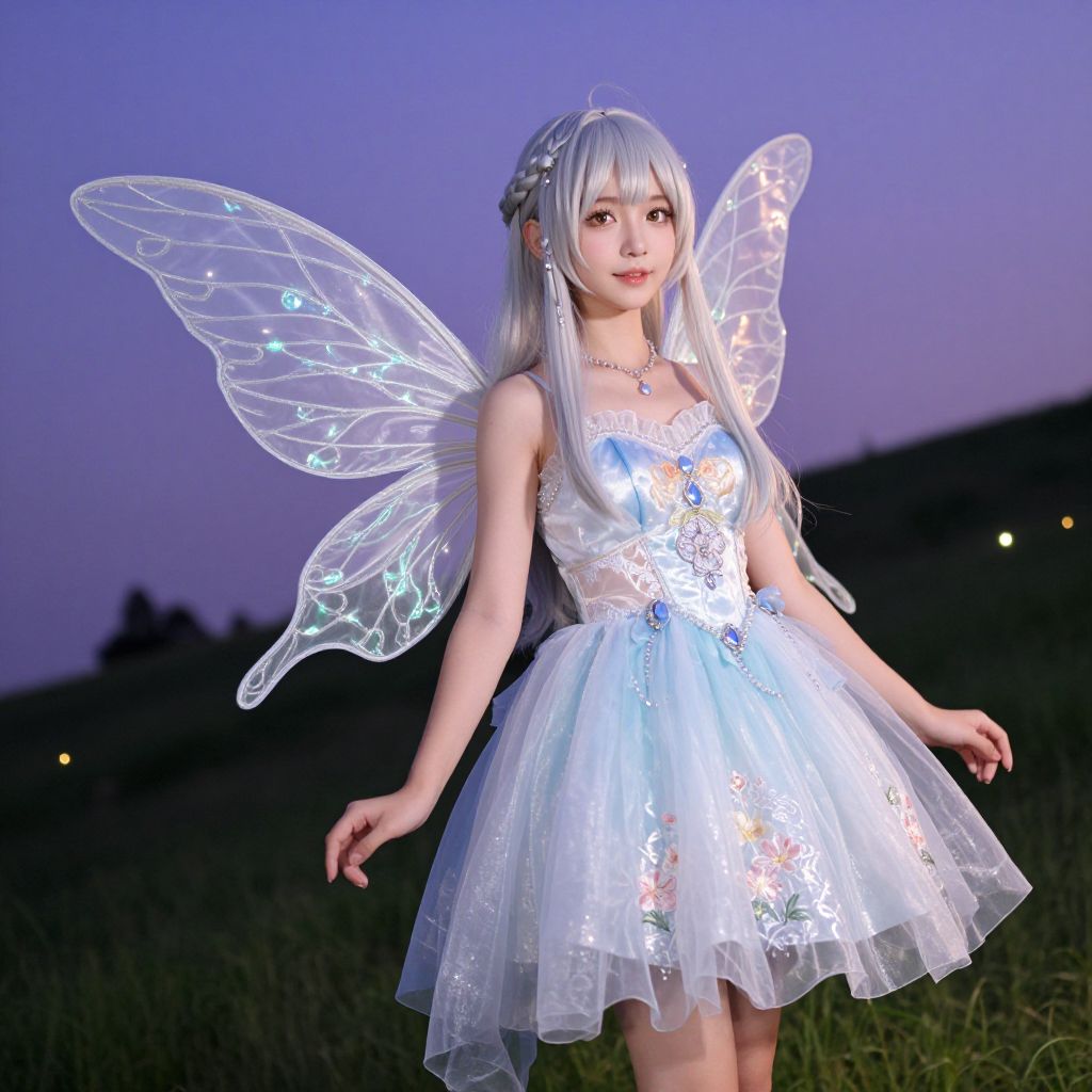 A digital CGI image of an anime-style young woman with long, white hair and fair skin, wearing a sparkling, white, lace-trimmed, tulle dress with floral embroidery. She has large, translucent fairy wings adorned with blue and white patterns, and a silver hairpiece. Her expression is gentle, and she stands against a twilight sky with a dark, grassy field in the background. The soft glow of the twilight highlights her ethereal appearance, giving her a magical, fairy-like presence. Small, distant lights are scattered in the background.