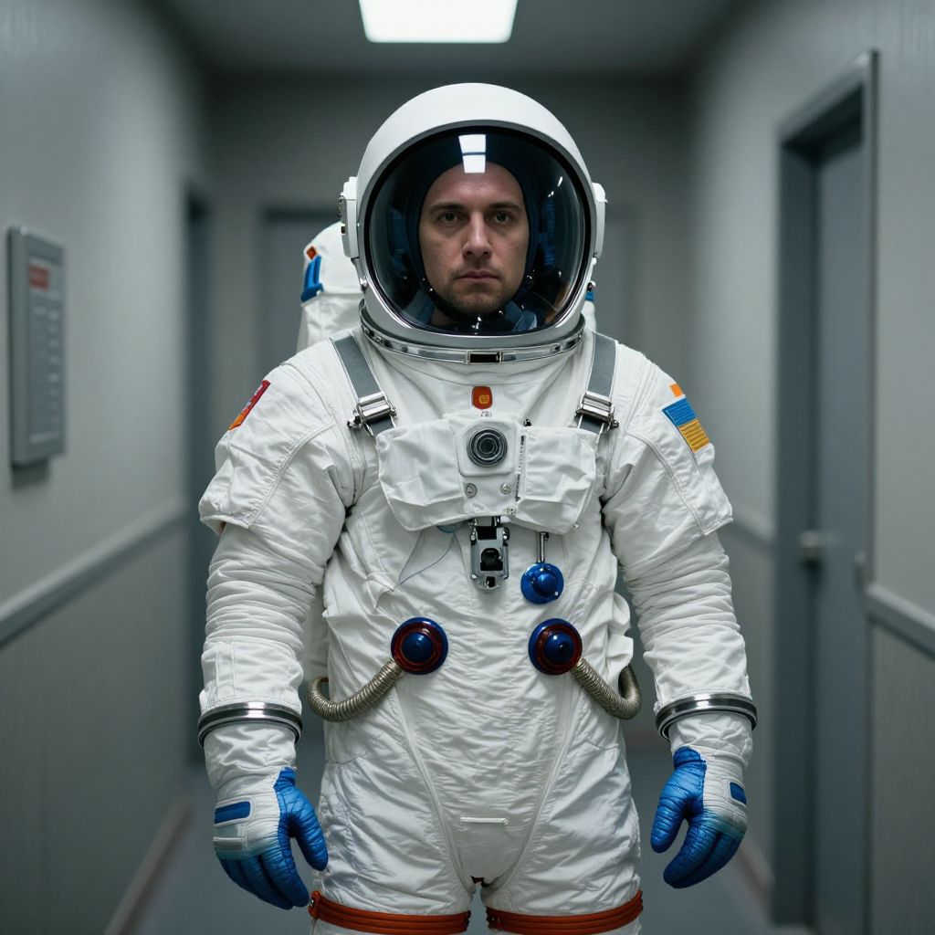 Photograph of a serious-looking man in a white astronaut suit with a reflective helmet, standing in a narrow, dimly lit hallway.