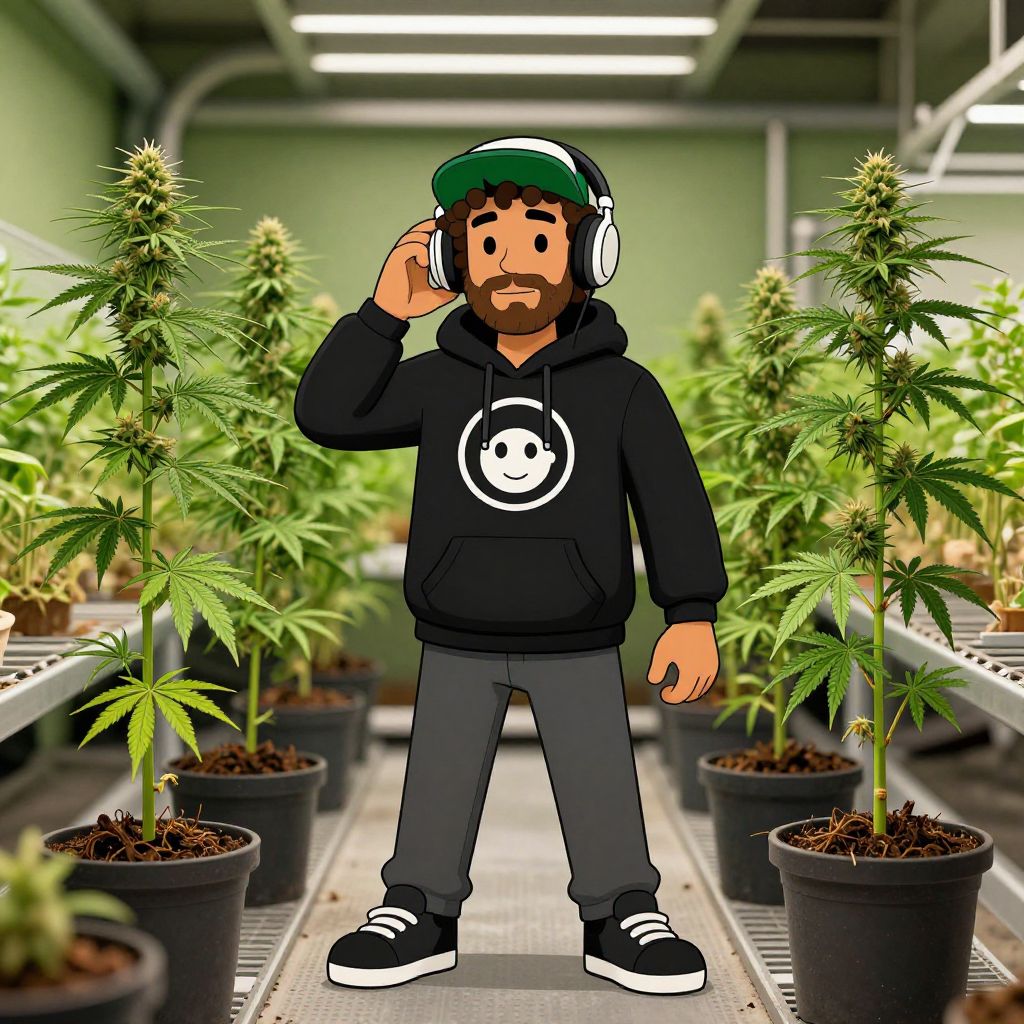 In this vibrant and detailed cartoon, a man with curly hair and a beard stands confidently in front of an industrial cannabis grow. He is wearing a black hoodie with a circular logo featuring a face, and a green cap. The man is also adorned with headphones, suggesting he might be listening to music or podcast. Surrounding him are several potted cannabis plants, their green leaves reaching upwards, indicating healthy growth. The plants are placed on shelves and on the floor, creating a lush environment. The background features a green wall and a ceiling with a light fixture, adding to the industrial feel of the setting. The overall composition is dynamic, with the man positioned centrally, the plants framing him, and the shelves and ceiling elements providing depth and context to the scene.