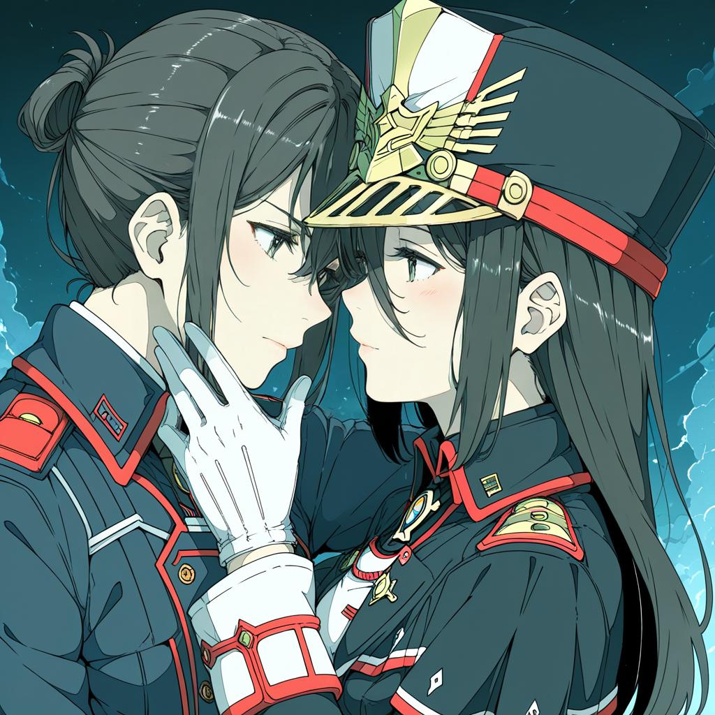 Morag ladair (xenoblade), xenoblade chronicles (series), 1girl, brown eyes, hair between eyes, black hair, long hair, military uniform, white gloves, military uniform, by artist ninimo nimo, dark_illustrious