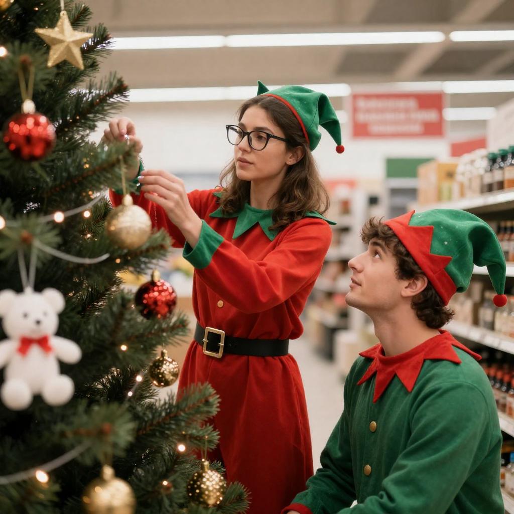 Photograph of a Christmas scene in a store. A woman in a red elf costume with green headband and glasses decorates a lit Christmas tree, while a man in a green elf costume looks up at her. The tree is adorned with ornaments, lights, and a white plush toy. Background includes store signs and shelves.