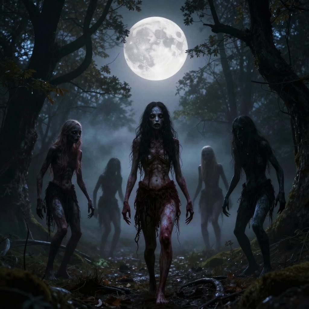 Skin walkers pictures of eerie humanoid creatures transforming under a full moon, set in a dense forest with twisted trees, fog rolling in, haunting eyes glowing, capturing a mystical and terrifying atmosphere.
