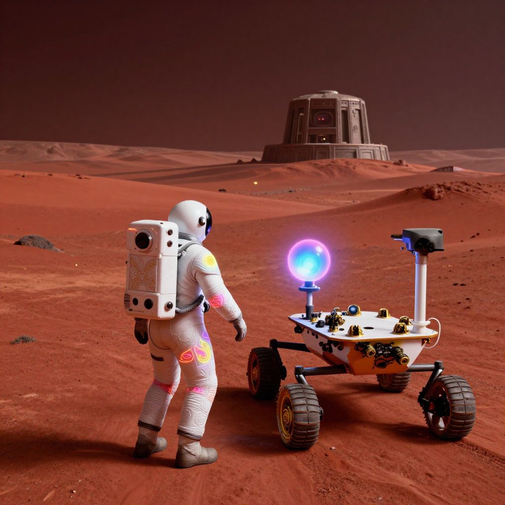 Envision a vast Martian terrain reminiscent of classic space art, viewed from the perspective of an agile rover traversing across a seemingly endless red desert. The scene embodies human exploration with a solitary astronaut in a sleek white spacesuit adorned with intricate neon patterns akin to Art Nouveau. This figure carries a vibrant, glowing orb that illuminates their path, evoking a sense of hope and wonder amidst the desolation. As they approach an ancient alien structure in the distance, shadows and colors interact dynamically, creating an atmosphere filled with curiosity and awe for the enigmatic wonders yet to be uncovered on this new world.