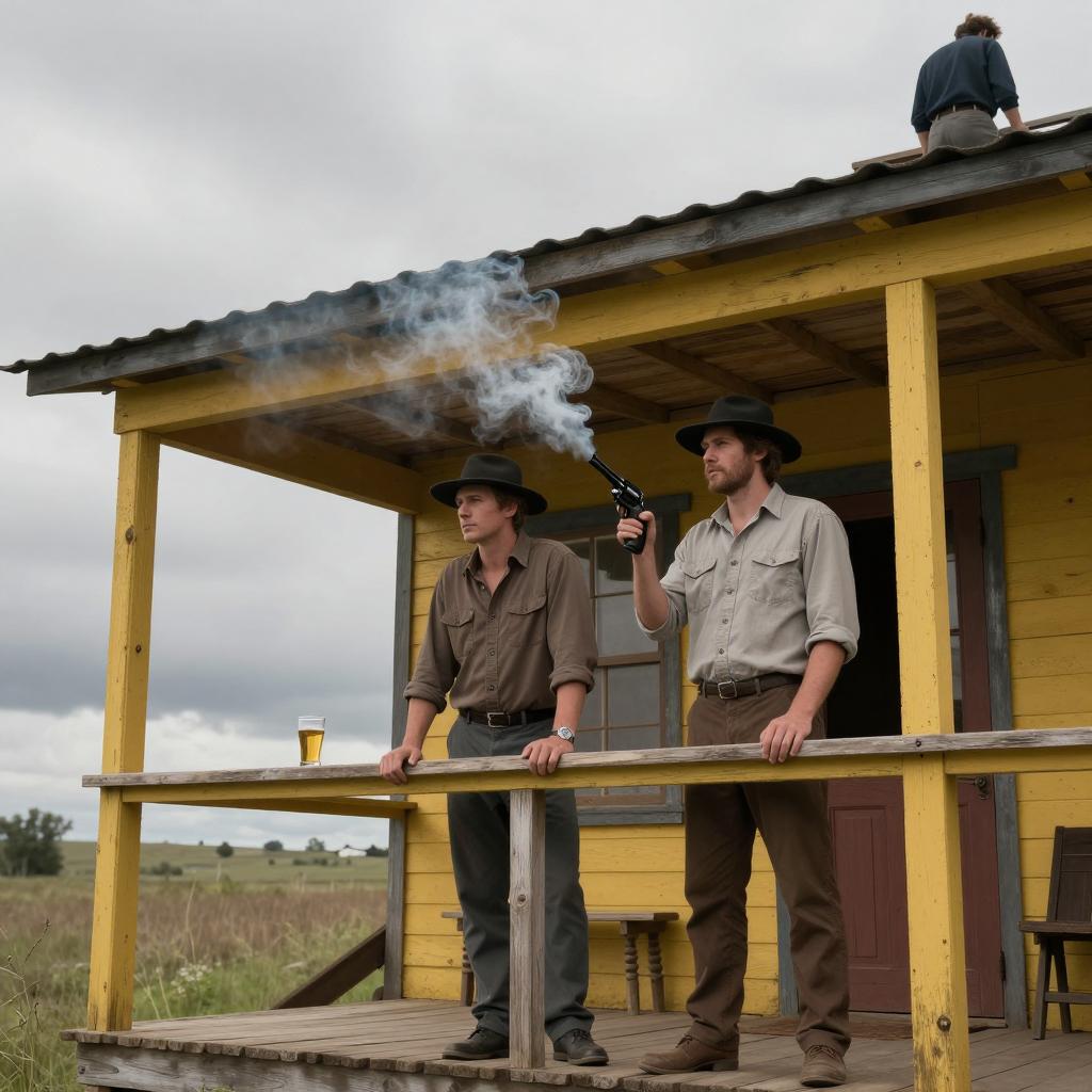 Photograph of two people in a grassy field, aiming rifles. Female in front, blonde, wearing a beige hat and white shirt, intense focus. Male behind, brown hair, brown hat, green shirt, brown vest, open mouth in surprise. Trees and shrubs in background. Both holding rifles, aiming forward.