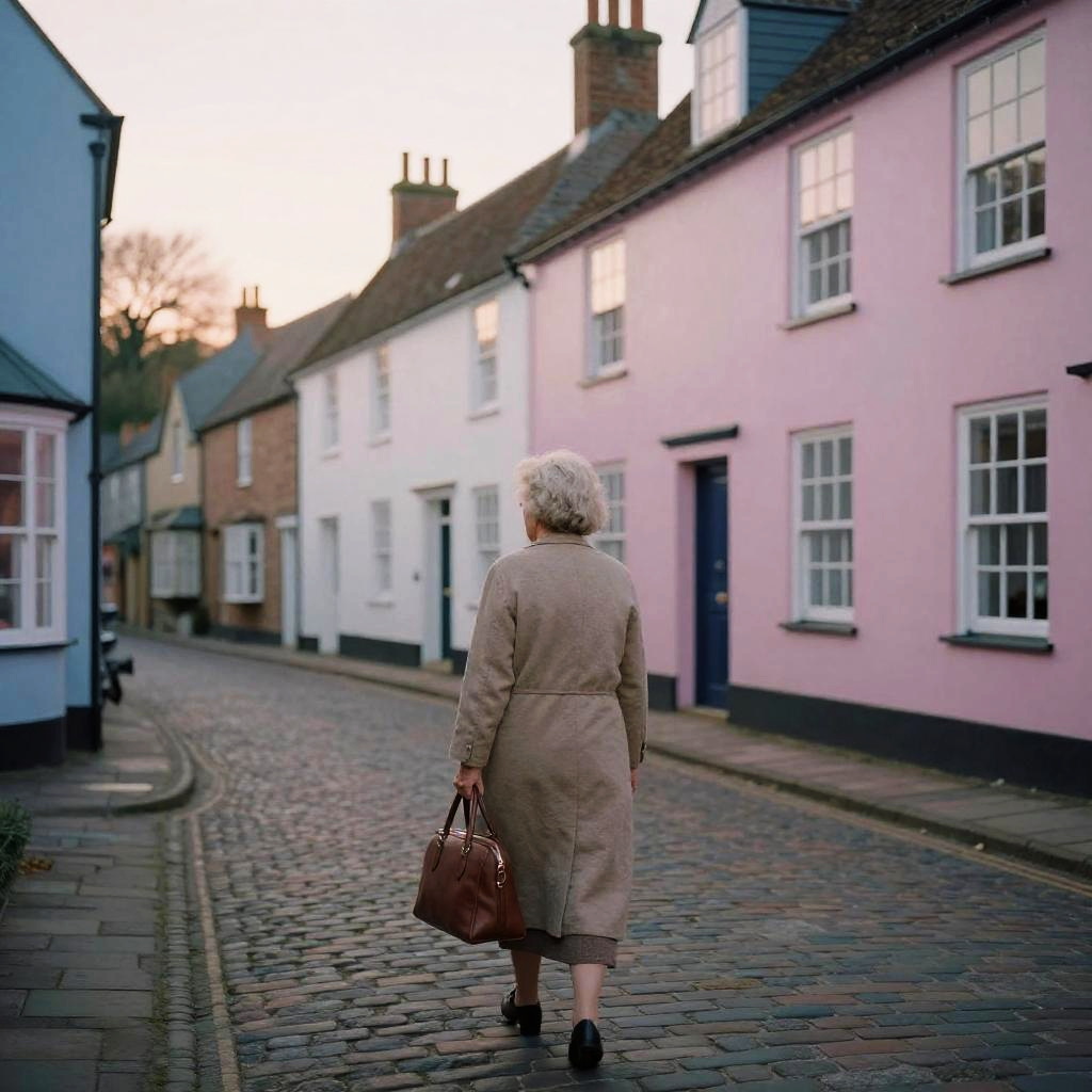 Old Missy Cooper exploring a quaint village street at dusk, carrying a vintage handbag, historic buildings with cobblestone paths, soft pastel colors, atmospheric and charming