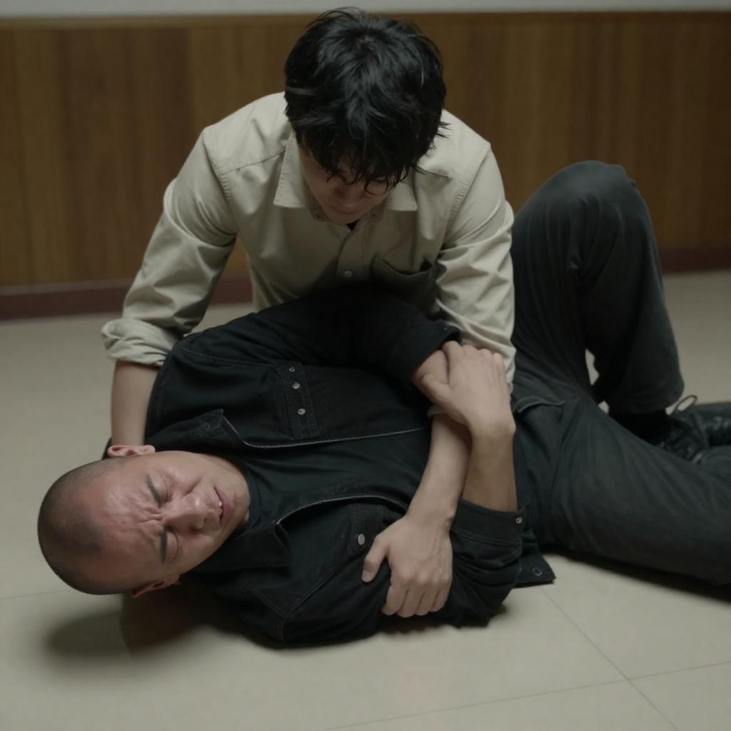 Two men in a dimly lit room. Top man, with messy black hair, beige shirt, and black pants, pins down bottom man, who has balding head, black jacket, and dark pants. Bottom man's face shows intense pain, eyes closed. Top man's face is focused. Tile floor and wooden walls in background. Top man's hands grip bottom man's arms tightly.