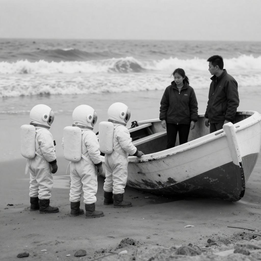 Black-and-white photograph of four children in white space suits standing near a partially submerged, damaged boat on a sandy beach. Two adults in dark clothing stand in the boat, which is tilted to the right. A child with a helmet faces away in the foreground. Waves crash in the background.