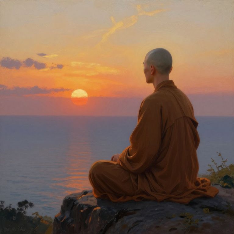 Photograph of a bald, fair-skinned male Buddhist monk with a slender build, seated in a lotus position on a rocky cliff. He wears a loose, brown robe. The monk faces a serene ocean at sunset, with the sun partially hidden behind the horizon, casting an orange and pink glow across the sky and water. Soft clouds are scattered in the sky, and the monk's robe and the rocks are in shadow, creating a peaceful, contemplative atmosphere. Sparse vegetation is visible in the lower right corner.
