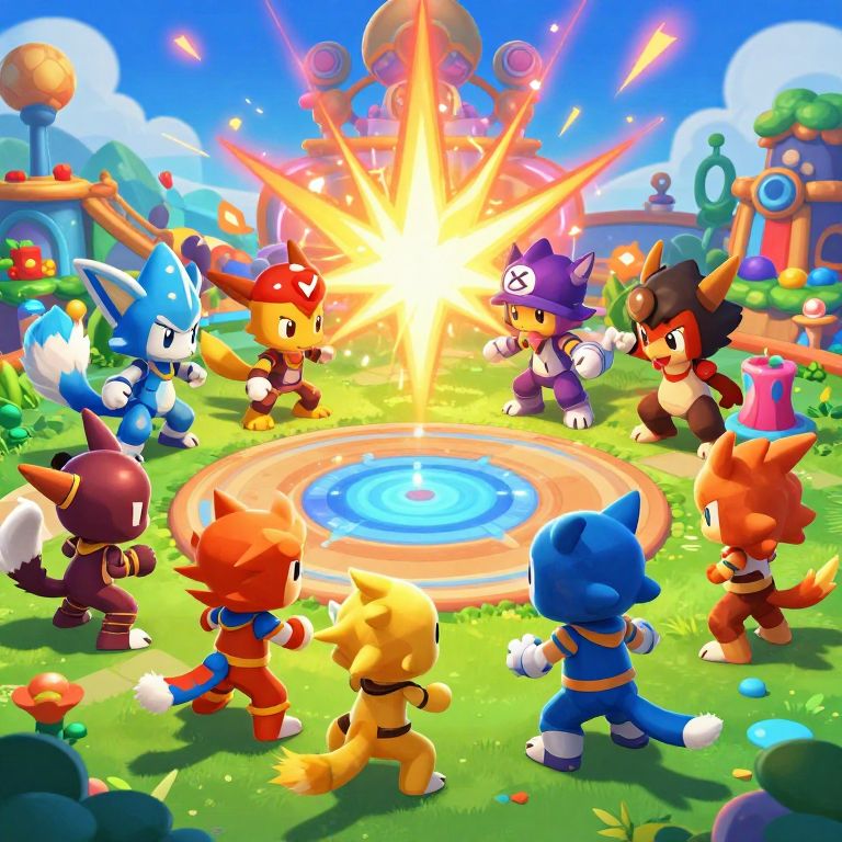 Pokemomshowdown battle scene, featuring dynamic creatures engaged in an epic showdown in a vivid fantasy arena, electric sparks and magical energy bursts, vibrant colors, highly detailed, digital art style