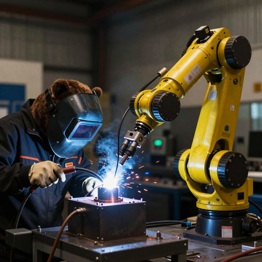 Bear welding a robot arm in an industrial setting, dramatic shadows, glistening metal surfaces, focused expression, highly detailed, cinematic atmosphere