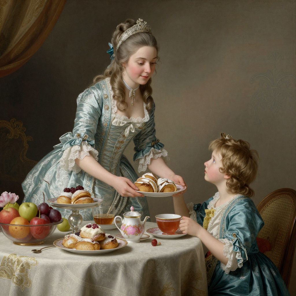 Photograph-style painting: Elegant young woman in blue satin dress with crown, offering pastries to seated child in similar dress, at a table with te