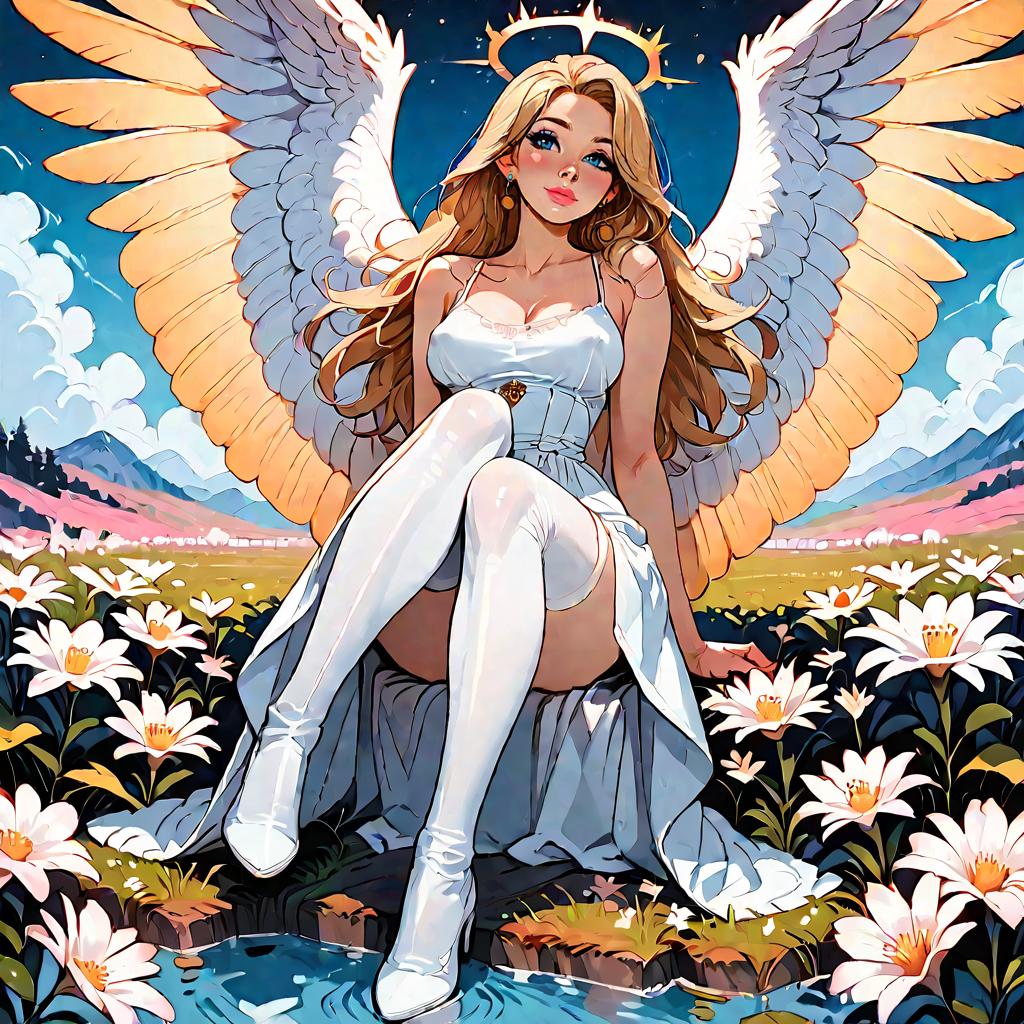 (anime, source_anime, high quality, highres), score_9, score_8_up, score_7_up, score_6_up, score_5_up, girl with sparkling blue eyes and medium breasts sit on flower field, girl has light smile on her face, perking breasts, covered nipples, no bra, no panties, girl dressed in white camisole and has halo ring on her head and wearing white legwear, girl has white and gold feathered angel wings, outdoors, scenery, landscape, nature, mountainous horizon, golden hour, sunrise, shining light particles, (full body, full body shot)