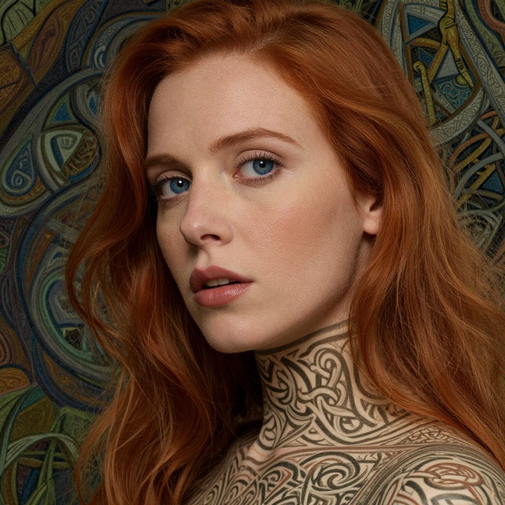 Photorealistic portrait of a red-haired woman with intricate neck tattoos, blue eyes, and fair skin, set against a colorful, Celtic-inspired background.