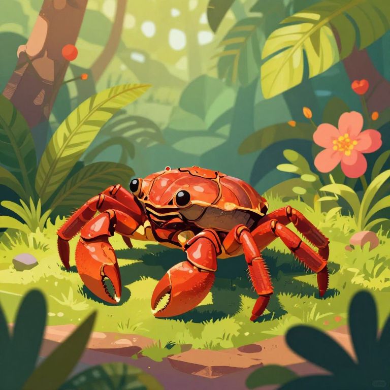 Cangrejo en ambiente tropical, con plantas y flores exóticas alrededor, luz cálida de sol filtrándose entre hojas, estilo ilustración digital semi-realista, detalles en el caparazón y sombra suave, atmósfera alegre y colorida.