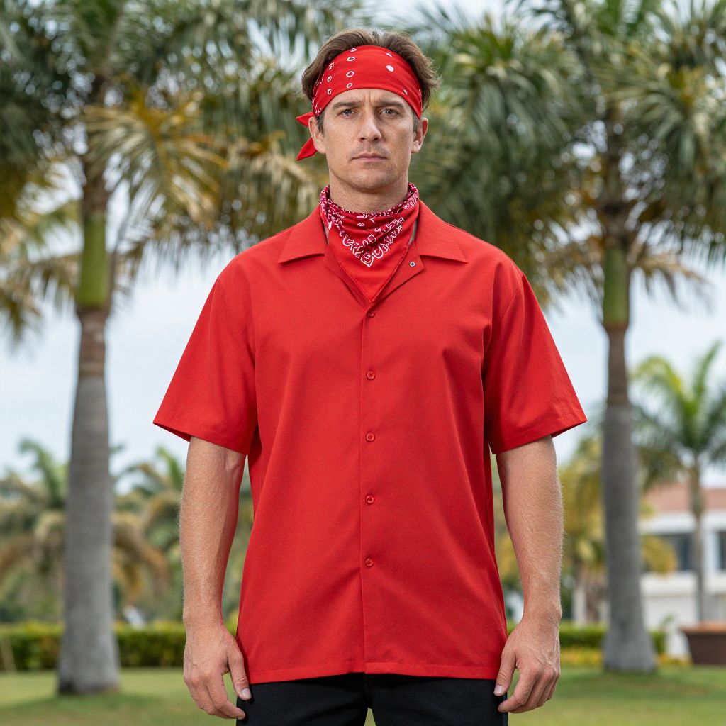 Photograph of a middle-aged Caucasian man standing in a tropical outdoor setting with palm trees in the background. He has short brown hair, a serious expression, and wears a red bandana with white patterns tied around his head. He is dressed in a bright red short-sleeved button-up shirt, matched with a red bandana around his neck, and black pants. The shirt is slightly loose-fitting, and his arms are relaxed by his sides. The background features blurred palm trees and a green lawn, suggesting a warm, sunny climate. The overall image has a slightly over-saturated color effect, enhancing the vividness of the red attire.