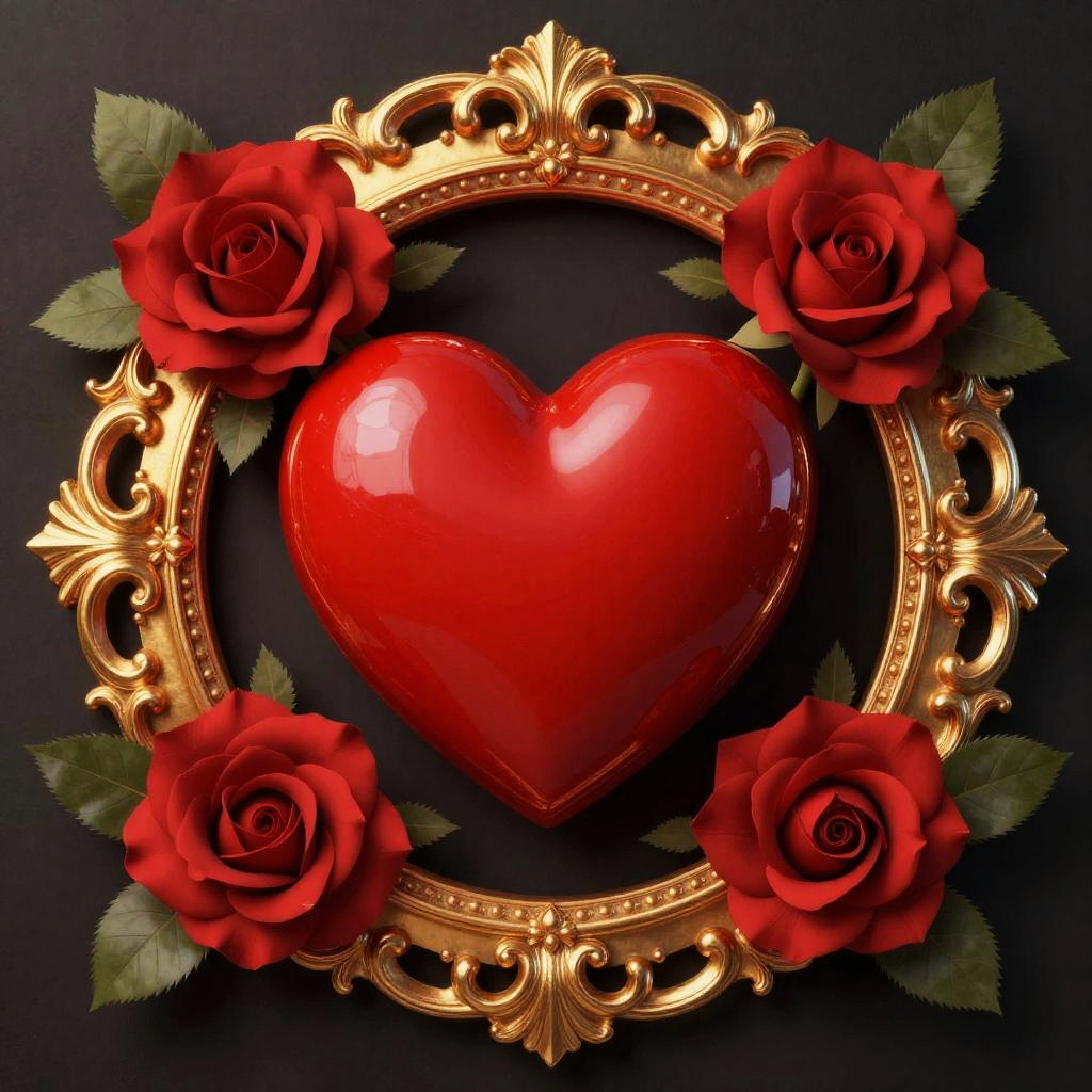 A digital illustration features a glossy, bright red heart at the center, surrounded by an ornate, gold-framed circular wreath. Four vibrant red roses with green leaves are evenly spaced around the frame. The background is solid black, creating a striking contrast that highlights the heart and golden frame. The heart has a shiny, reflective surface, and the roses are detailed with realistic petals and textures. The gold frame is intricately designed with floral and scroll motifs, adding an elegant, vintage touch to the composition. The overall style is rich and romantic, emphasizing love and beauty.