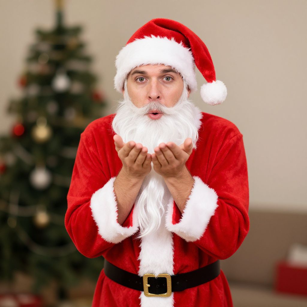 Photograph of a young man with blue eyes, wearing a red Santa hat and red Santa outfit with white trim, in front of a blurred Christmas tree