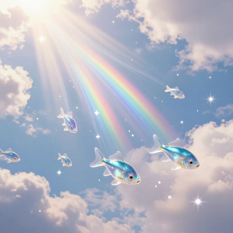 A whimsical digital illustration depicts glass-like fish swimming gracefully against a radiant backdrop of sunbeams and stars, creating ethereal rainbow trails as they ascend through a dreamy sky filled with clouds and sparkling particles.
