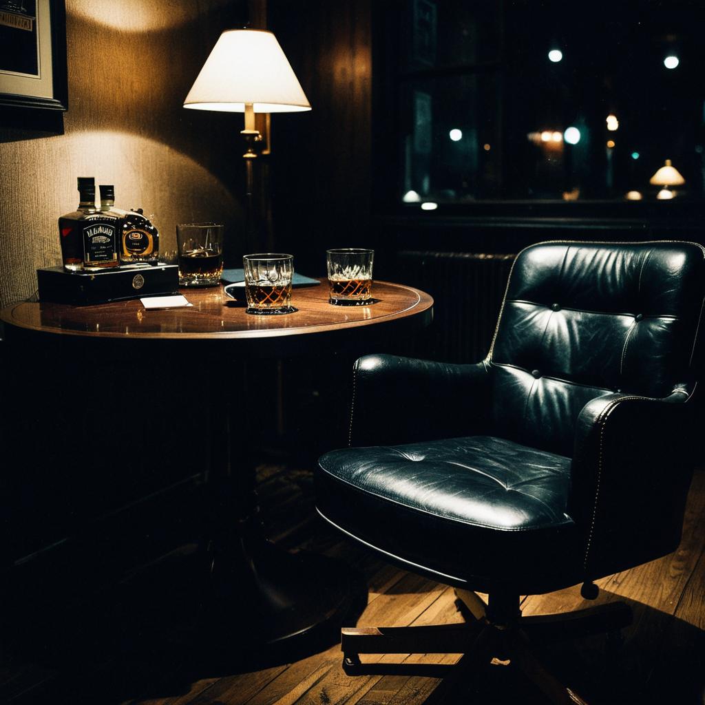 Image of a dimly lit jazz lounge, with a round black desk, black leather chair, and a glass of aged whiskey, nighttime ambiance