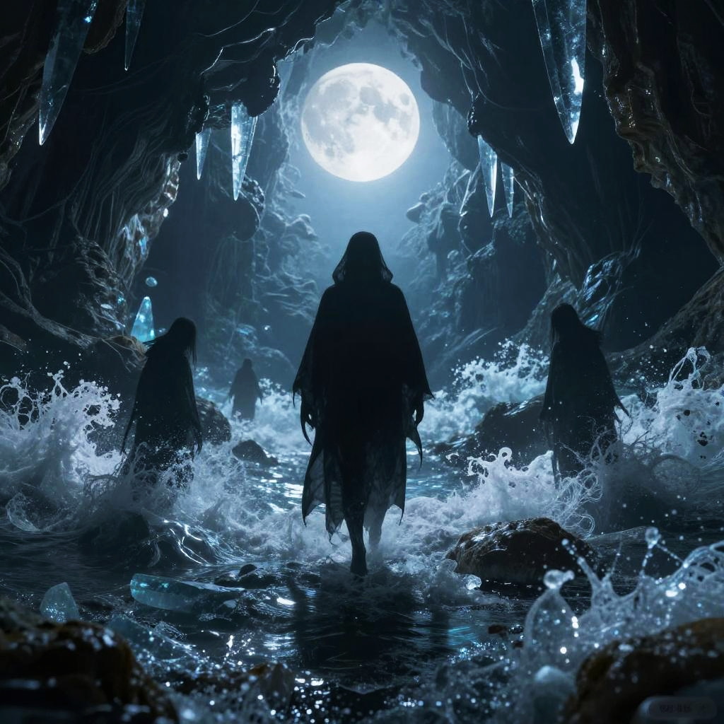 A surreal and mystical forest scene featuring an ethereal atmosphere with dense fog and twisted, moss-covered trees. A solitary, shadowy figure resembling an elf stands near a reflective stream, surrounded by other indistinct shadowy inhabitants. The environment evokes a sense of mystery and fantasy, blending dreamlike elements with natural chaos.