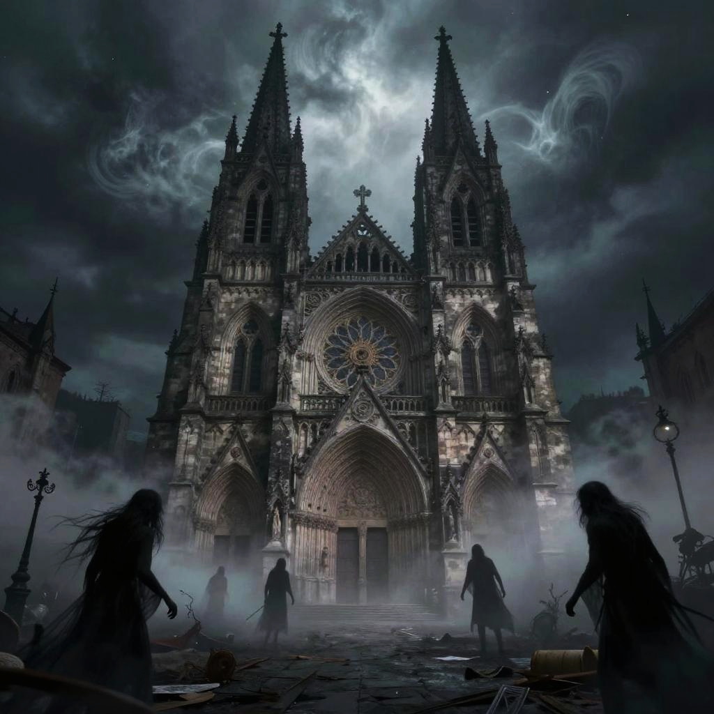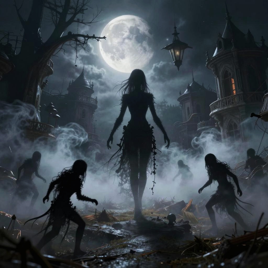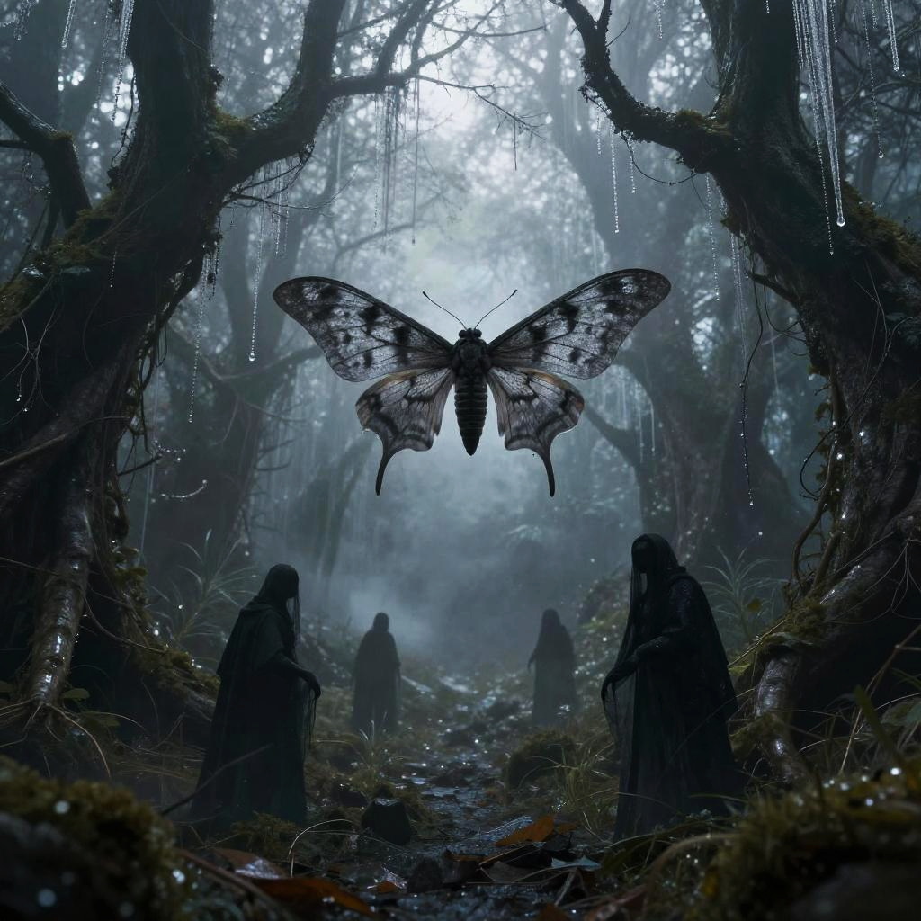 Imagine a Mysterious Elf in the Ethereal Forest, where swirling winds mingle with dense fog. The inhabitants, appearing as shadowy figures, navigate a landscape where dreams intertwine with reality's chaos.
