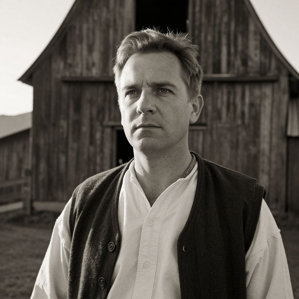 This black-and-white photograph depicts a middle-aged Caucasian man with short, slightly spiky hair, standing in front of a rustic wooden barn. He has a serious expression and is wearing a white, button-up shirt with a dark vest over it. The barn in the background has weathered wooden planks and a large open doorway. The image has high contrast, emphasizing the textures of the man's clothing and the barn's wood. The lighting creates sharp shadows, adding a dramatic effect to the overall composition. The man's skin is light, and his eyes are slightly squinted, giving him a focused look.