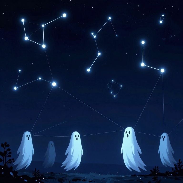 Digital illustration in a whimsical, cartoon style depicting four glowing white ghost-like figures with simple black eyes, standing in a dark, starry night sky. The background features a constellation of connected stars, with a few smaller stars scattered throughout. The ghosts are positioned in a line at the bottom, with their white, flowing, translucent bodies contrasting against the deep blue and black hues of the night. Silhouettes of plants are visible at the bottom, adding depth to the scene. The overall atmosphere is eerie yet playful, with a focus on the ethereal glow of the ghosts and the celestial arrangement above.
