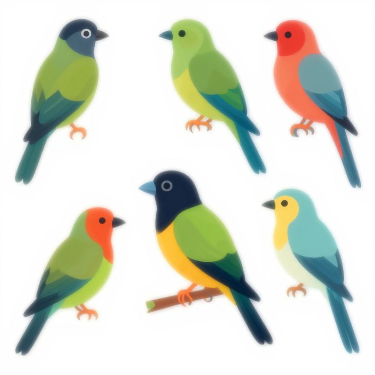 Digital illustration of six colorful birds with varied bright red, green, blue, and yellow plumage, perched on white background.