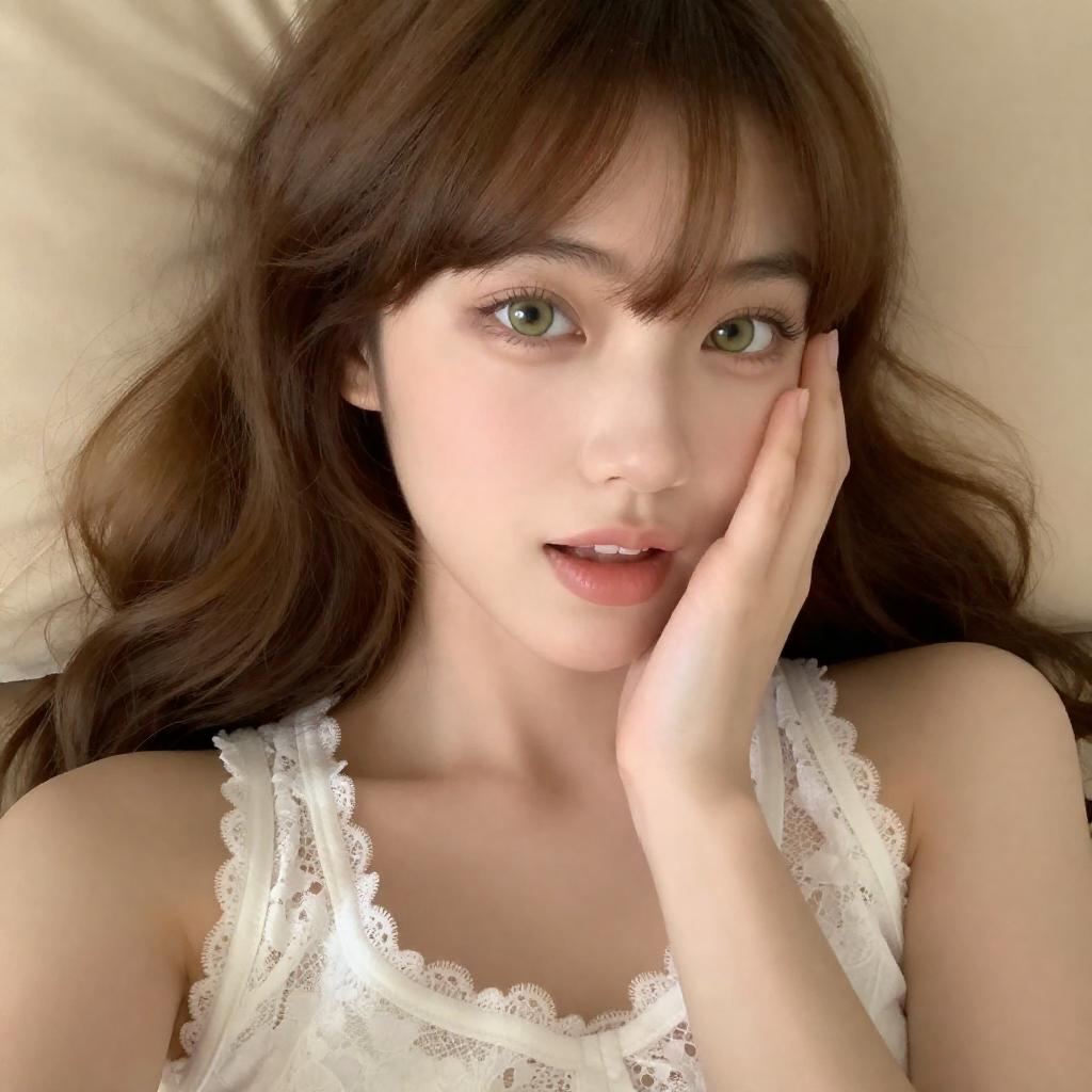 Close-up photograph of a woman with light green eyes, light brown wavy hair with bangs, wearing a white lace tank top. She is lying on a beige pillow, head resting on her right hand, looking directly at the camera with a slightly open mouth. Soft, warm lighting.