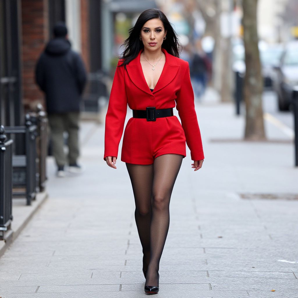 Photograph of a confident woman with long black hair, wearing a vibrant red blazer and shorts, black belt, black stockings, and heels, walking
