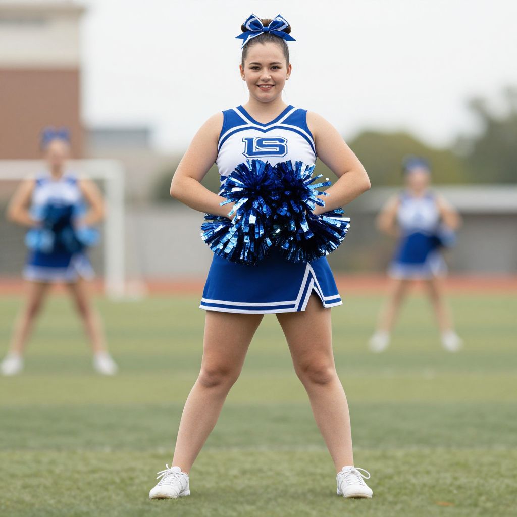 Photograph of a smiling young female cheerleader in blue and white uniform, holding blue pom-poms, standing on grassy field with blurred background and