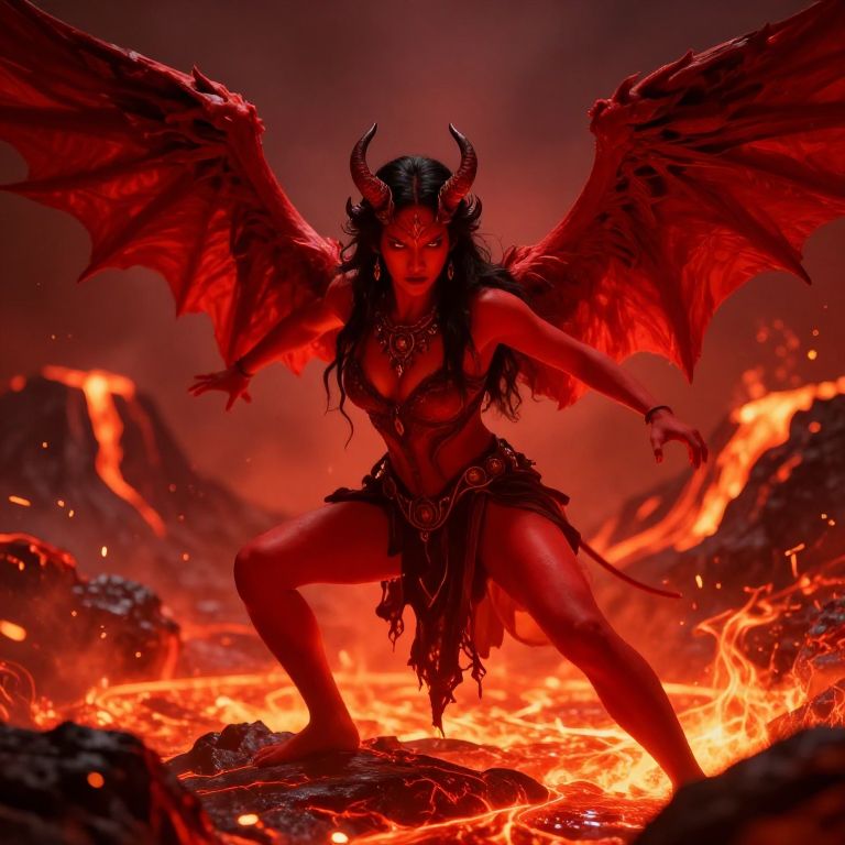 Red skin demon girl in a fiery volcanic landscape, molten lava flowing, wings spread wide behind her, fierce expression, battle-ready stance, ancient demonic jewelry, dynamic pose with glowing embers floating around, vivid color palette