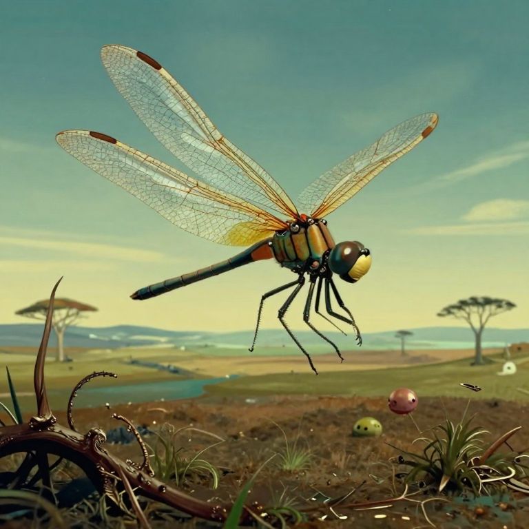 Photograph of a vividly colored dragonfly in mid-flight above a grassy, semi-arid landscape. The dragonfly has translucent, intricately veined wings with brown and yellow stripes, and a black and yellow body. In the background, there are distant trees, a blue sky with soft clouds, and a winding waterway. The foreground includes dry grass, small plants, and a red and green beetle. The image has a hyper-realistic style with rich, saturated colors and detailed textures, emphasizing the dragonfly's delicate wings and the natural setting.