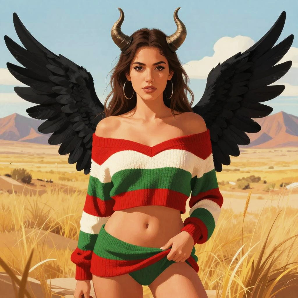 A digital illustration of a sexy, fair-skinned woman with long brown hair, black wings, and small horns. She's wearing an off-shoulder, red, white, and green striped sweater, exposing her left breast and midriff. She stands in a sunlit, desert-like landscape with golden grass and mountains in the background. Her expression is confident, and she holds the hem of her sweater with her right hand.