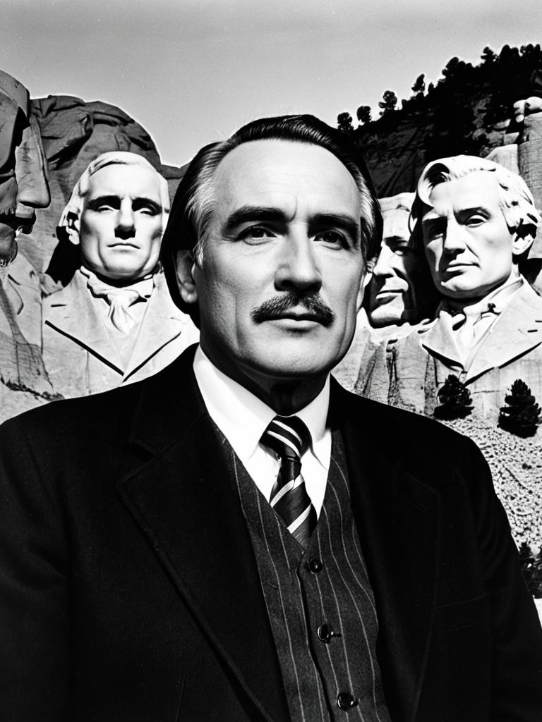 Photorealistic black and white studio portrait of a man dressed in a Mount Rushmore inspired costume standing in front of the Mount Rushmore National Memorial featuring the carved faces of four U.S. presidents. The man has a mustache and is wearing a light-colored suit jacket with a white shirt and black tie, creating a cinematic and humorous effect.