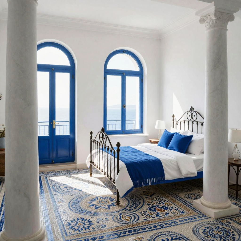 Greek inspired bedroom with white marble pillars, blue and white color palette, wrought iron bed frame, intricate mosaic floor, sunlight streaming through large arched windows