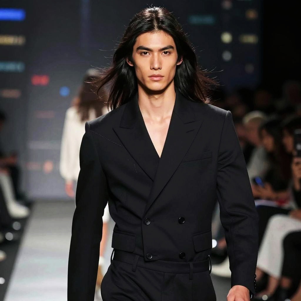 Male model long black hair standing confidently on a fashion runway, wearing a sleek modern outfit, dramatic lighting highlighting sharp facial features, urban background with blurred city lights, high resolution, dynamic pose, stylish and charismatic vibe