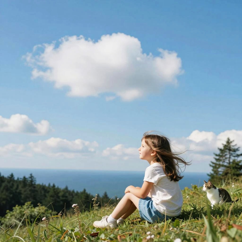 Little girl sitting on the hill looking at sky, with her hair blowing in clear day, with cat, (blue sky:1.25), sideway glance, young girl, cloud, endless sea, noon, summer, floating hair, cumulus clouds, forest, tree, face focus, cute, realistic, photorealistic, alone at the edge of a universe humming a tune