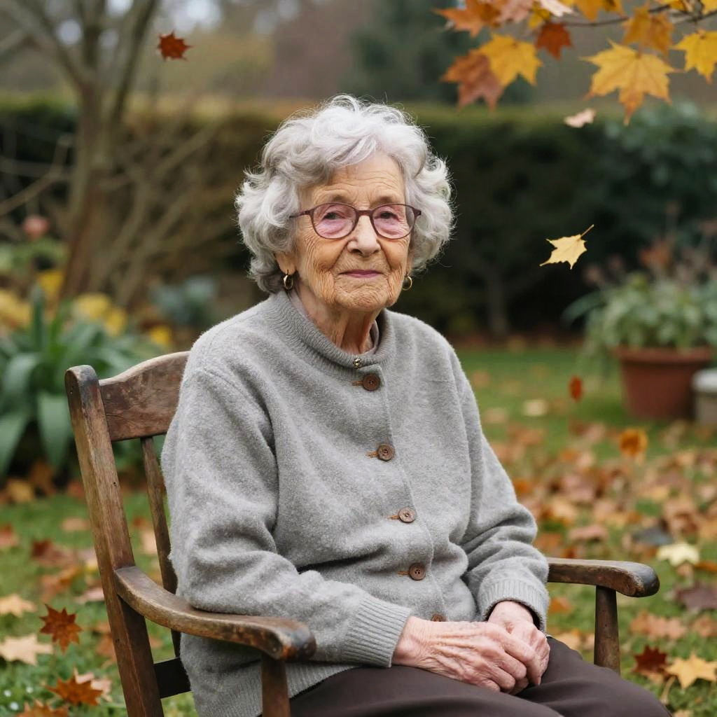 Portrait of old Missy Cooper with silver hair and glasses, sitting in a rustic wooden chair in a peaceful garden, autumn leaves falling, soft focus, warm and inviting atmosphere