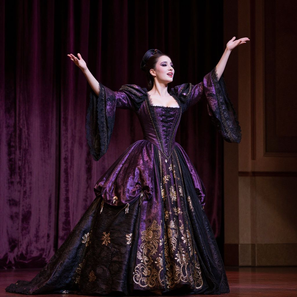 A graceful opera singer diva with delicate porcelain skin, high cheekbones, and a confident, regal expression, performing during a midnight performance in a vintage opera house with velvet curtains and dramatic chiaroscuro lighting, dressed in a majestic, elegant gown of deep purple and black with flowing lace and gold brocade, exuding sophistication and emotional intensity.