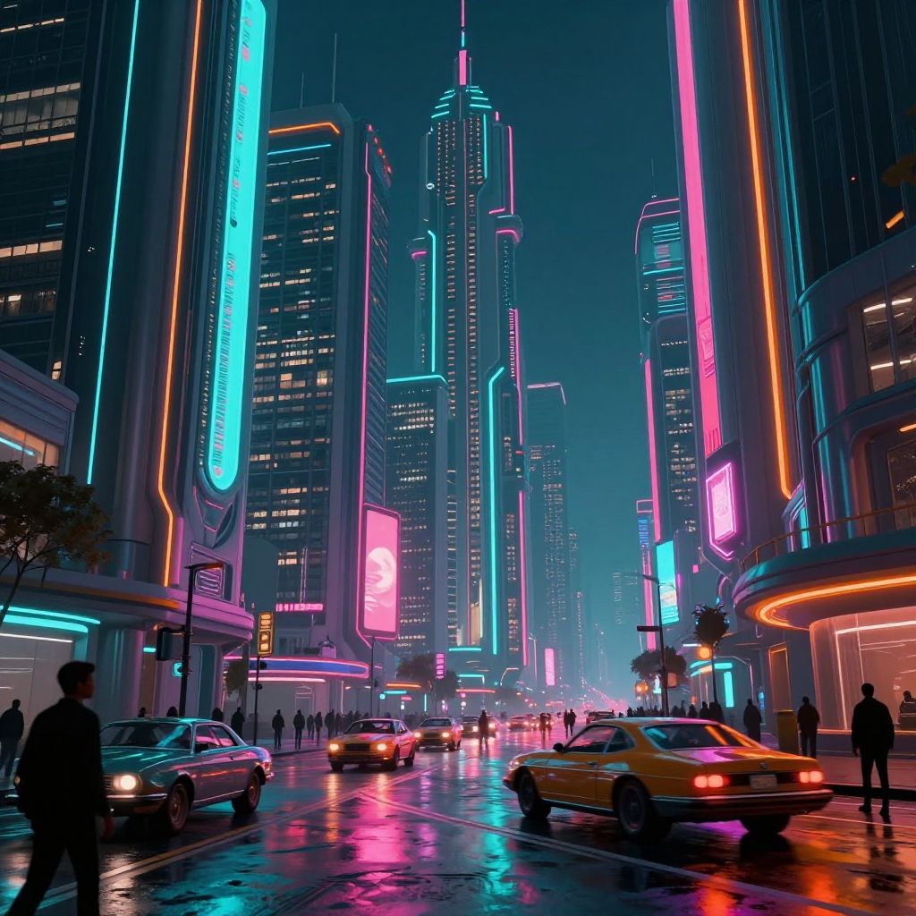 Highly detailed digital matte painting of a futuristic city street illuminated with neon lights. The scene features sleek, modern skyscrapers with vibrant cyan, pink, and orange neon accents, wet reflective streets, and retro-futuristic cars driving among silhouetted pedestrians. The cinematic angle and volumetric lighting create a moody atmosphere, capturing a cyberpunk aesthetic inspired by Syd Mead and James Gurney. Rendered in 4K resolution with Octane render.