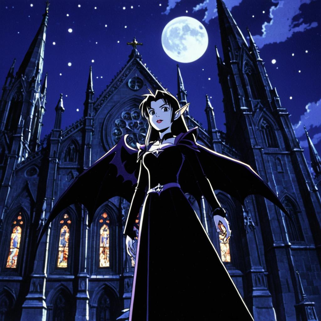 Selene the vampire, anime still from the 1999 Japanese anime television series 'Spyro x Sparks: Tondemo Tours', moonlit gothic cathedral