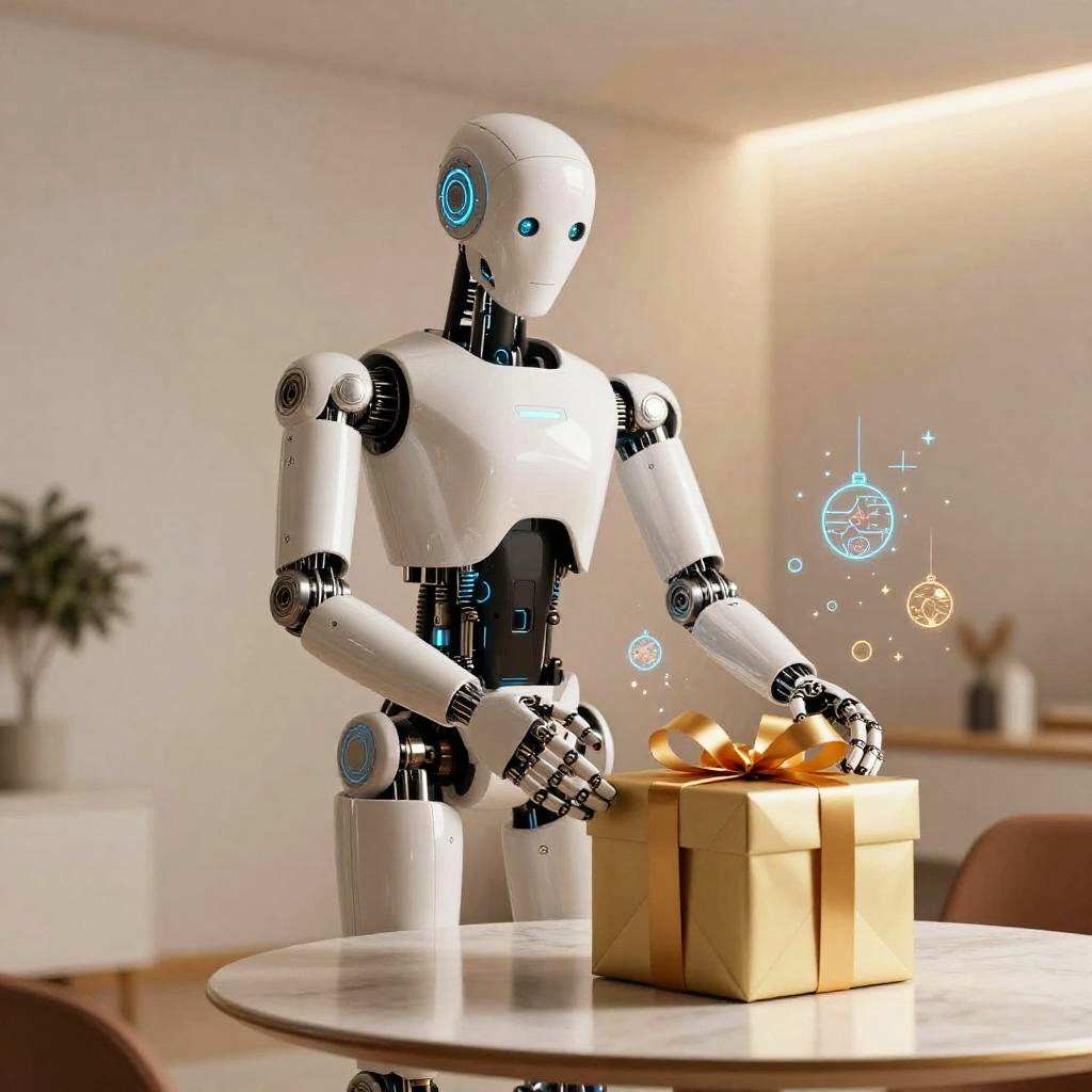 Gift AI portrayal of a robotic figure in a modern minimalistic room placing a high-tech gift on a table, soft ambient lighting, intricate mechanical details on the robot, digital ornamentation floating around, mixing warmth and advanced technology vibes.