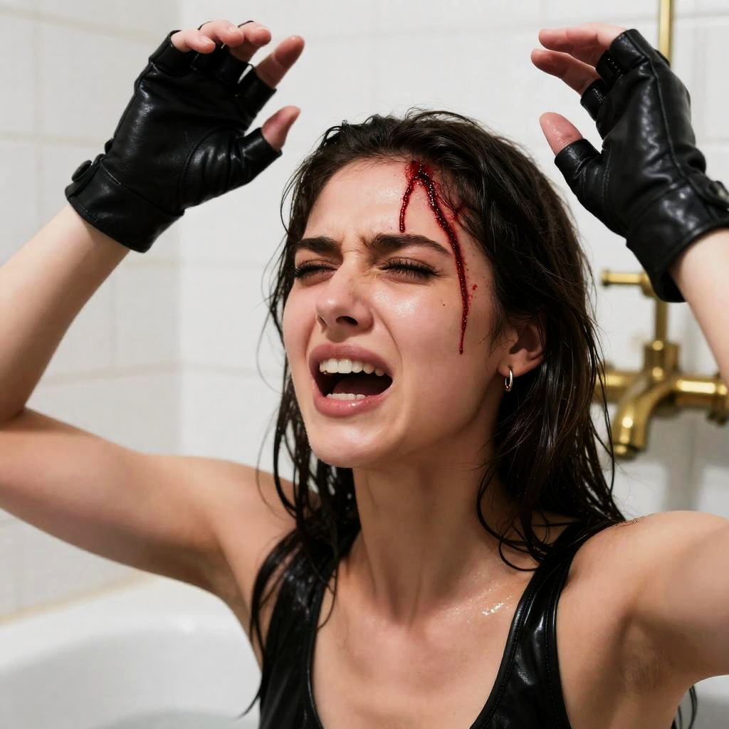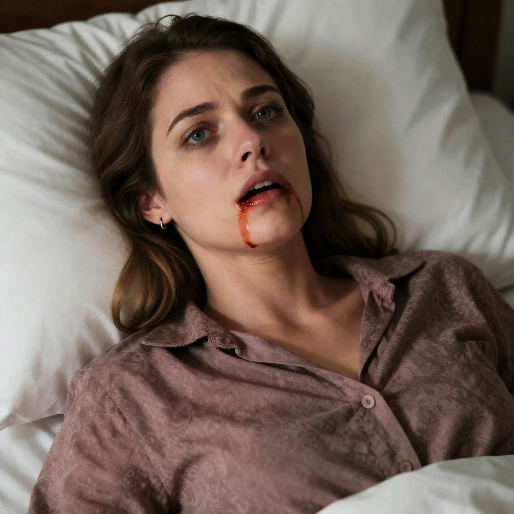 Photograph of a woman with brown hair, mouth open wide, blood pouring from her mouth and neck, white shirt, red and white patterned scarf, intense expression, blurred green and yellow background.