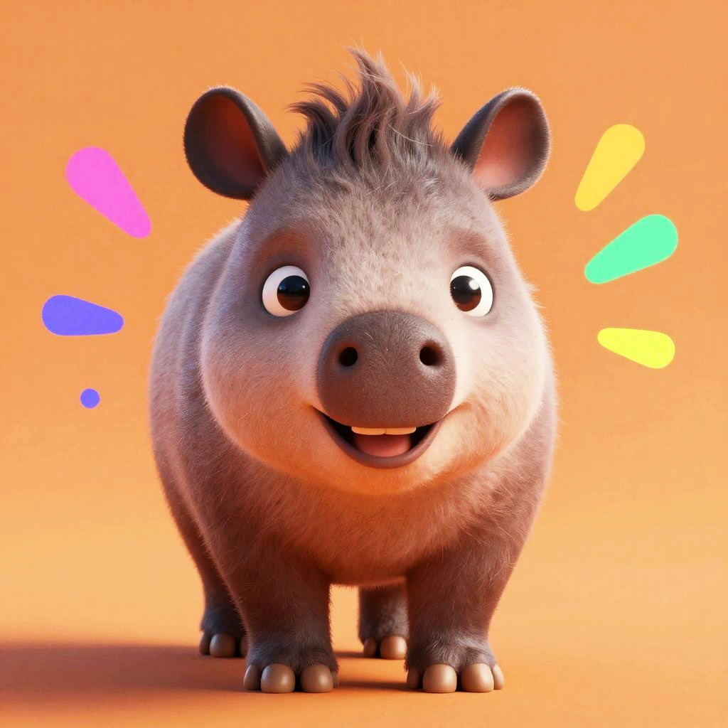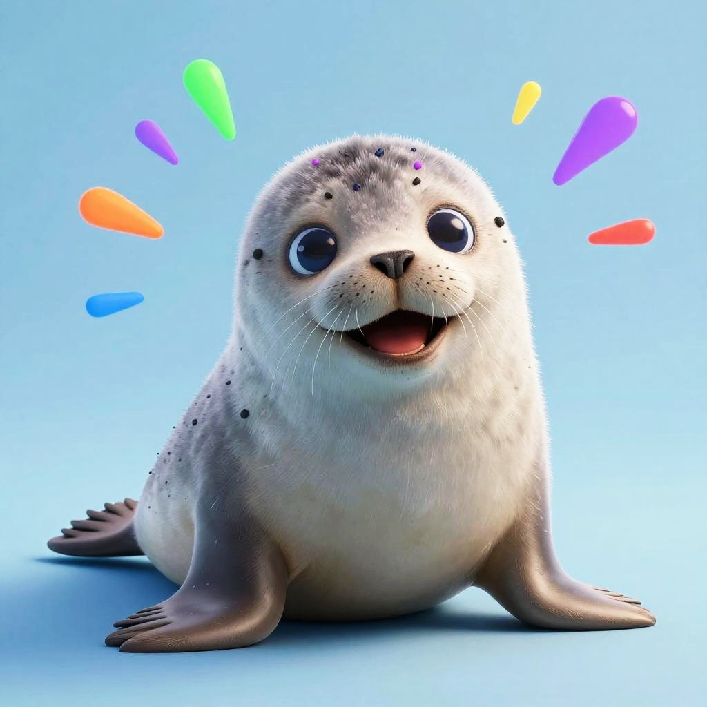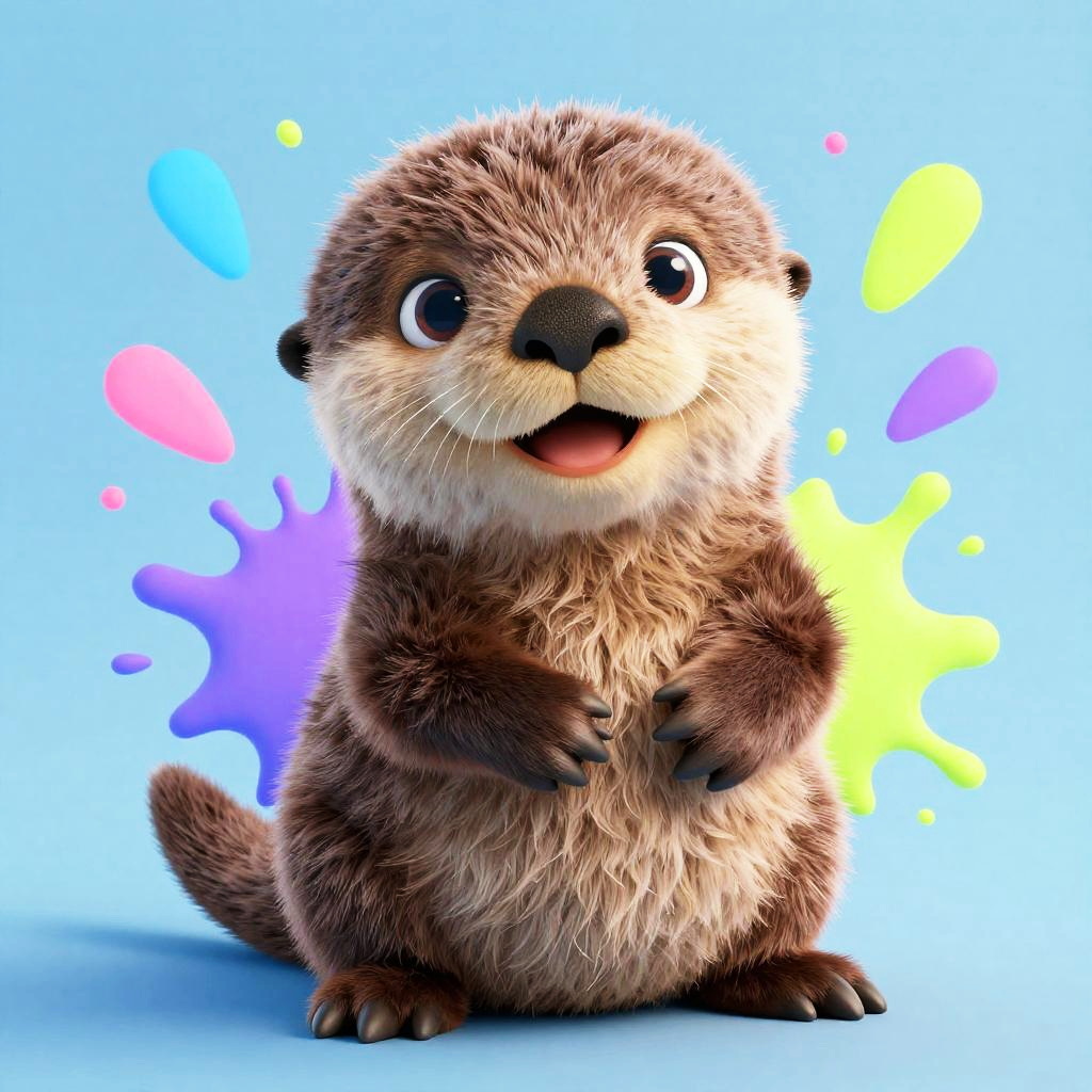 Realistic 3D render of a happy, colorful baby bear with fluffy fur and exaggerated cartoon features. The bear is smiling with big expressive blue eyes, sitting against a light blue background. Neon splatter accents in pink and blue enhance the playful Pixar-style design.